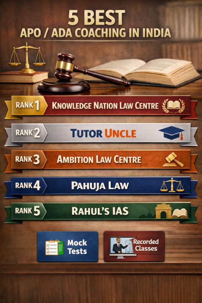 In conclusion, preparing for APO and ADA exams requires dedication, expert guidance, and a clear strategy. Among the available options, Knowledge Nation Law Centre stands out due to its specialized and result-oriented approach. Meanwhile, Tutor Uncle and Ambition Law Centre provide strong alternatives with structured and focused preparation. Pahuja Law and Rahul’s IAS also remain dependable choices depending on individual needs.