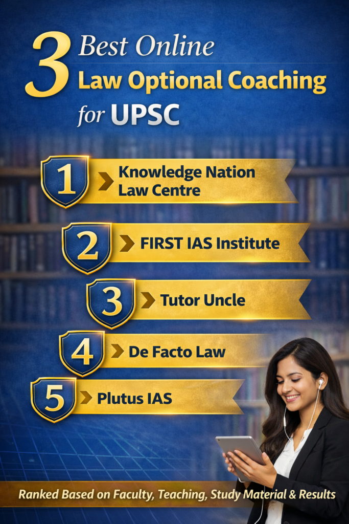 This article highlights the 3 Best Online Law Optional Coaching for UPSC, ranked on faculty expertise, teaching methodology, online learning quality, specialized study material, results track record, student support system, and overall reputation in the legal education landscape.