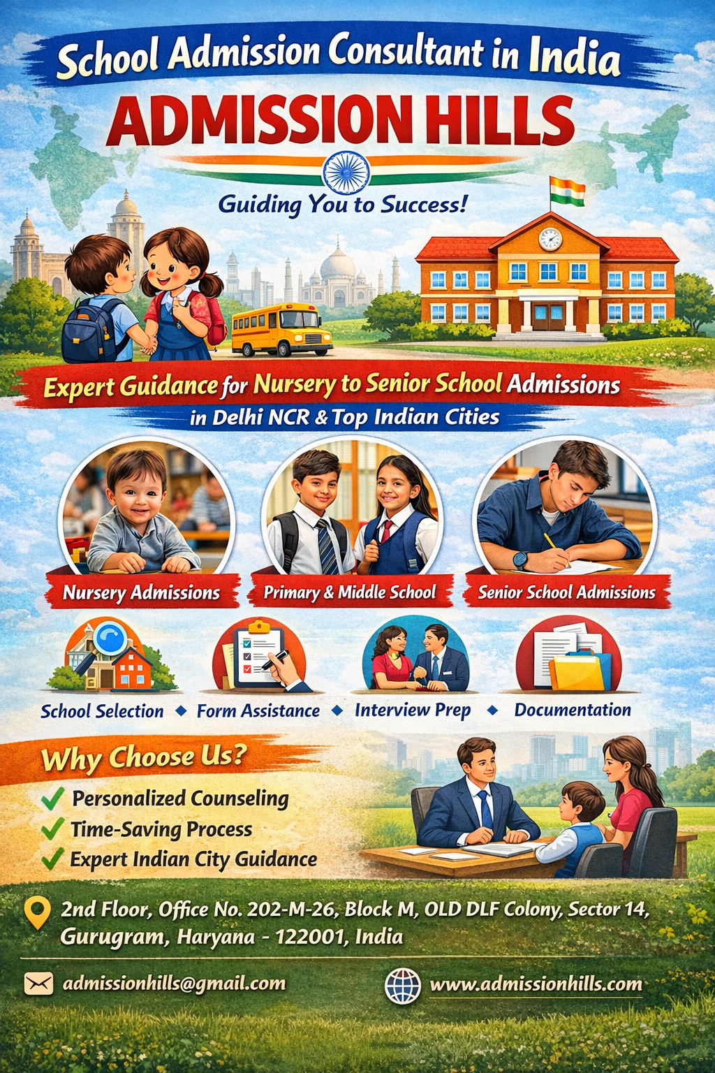 ADMISSION HILLS is a professional education consultancy specializing in school admissions across India, with a strong presence in Delhi NCR.